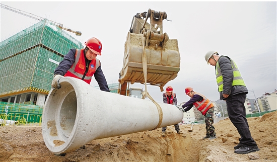 2月7日,景宁畲族自治县浮丘未来社区项目施工现场,工作人员正在加紧铺设雨污管道。 拍友 何彬峰 摄