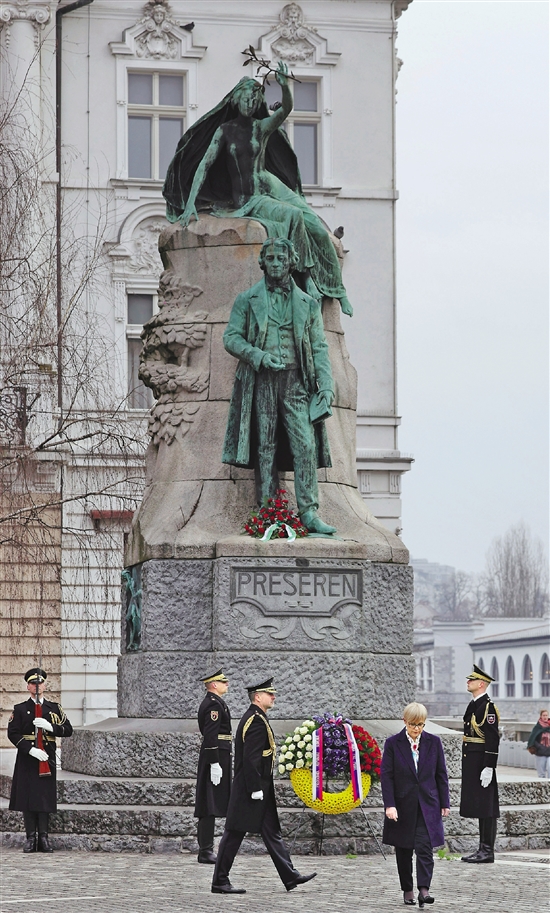 | 2月8日,斯洛文尼亚总统穆萨尔(前右)在首都卢布尔雅那向诗人弗朗斯·普列舍伦的纪念碑敬献花圈。当天,斯洛文尼亚多地举办纪念伟大浪漫主义诗人弗朗斯·普列舍伦的文化日活动,博物馆和其他文化机构免费向游客开放。 新华社发 |