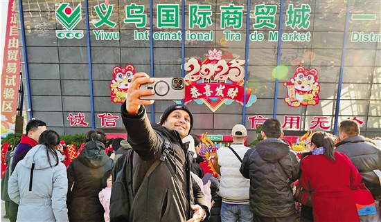 2月9日,义乌国际商贸城蛇年开市首日,来自沙特的客商阿海在商贸城前自拍。 本报记者 周旭辉 通讯员 时补法 摄
