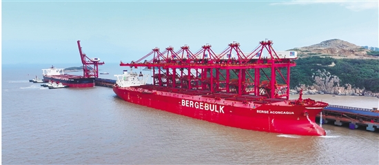 全球首次“双40万吨世界最大矿船”同靠鼠浪湖矿石中转码头 张磊 摄
