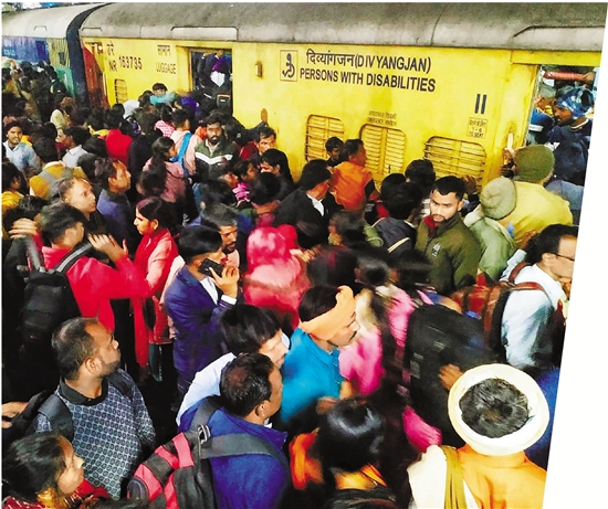 2月15日,人们在印度首都新德里火车站乘坐火车。