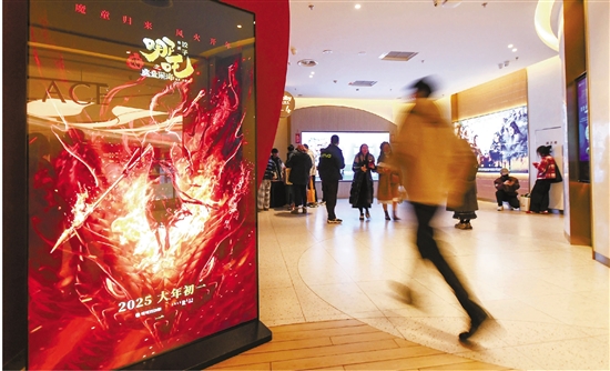 2月9日,在成都一家影院,观众经过《哪吒之魔童闹海》(《哪吒2》)的电子海报。