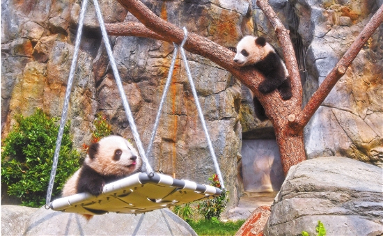 2月15日,大熊猫宝宝在香港海洋公园“大熊猫之旅”熊猫生活场馆内玩耍。 新华社记者 陈铎 摄