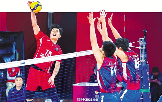 2月16日晚,在2024—2025赛季中国男排超级联赛季后赛第二阶段比赛中,浙江德清男排在主场德清体育中心以3比1战胜江苏男排,收获蛇年两连胜。 本报记者 王建龙 摄