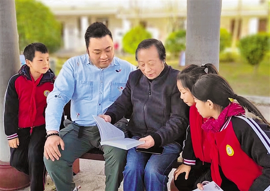 赵普义(左三)走进江山石门小学,跟师生讲解江山方言背后的故事。 受访者供图