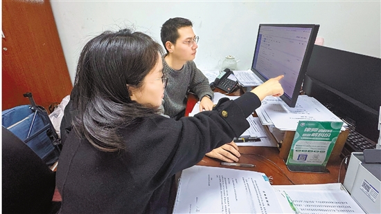 记者(右)在系统上查看分案情况。 拍友 卢艺文 摄