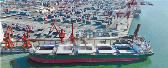 2月18日,在营口港鲅鱼圈港区,门机将玉米吊装到散粮运输船舶上。连日来,辽港集团营口港码头车船如织,一场大规模的粮食“迁徙”正值高峰。营口港粮食中转量长期位居北方港口之首,成为“北粮南运”的主枢纽港。 新华社记者 杨青 摄