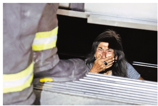 2月25日,在圣地亚哥,消防员营救一位因停电而被困在电梯里的老人。