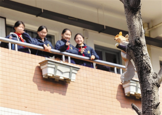 杭州市第六中学的学生们走出教室,在校园中的树上、墙上等地方,寻找刚在本学期摆放的各类小动物模型。