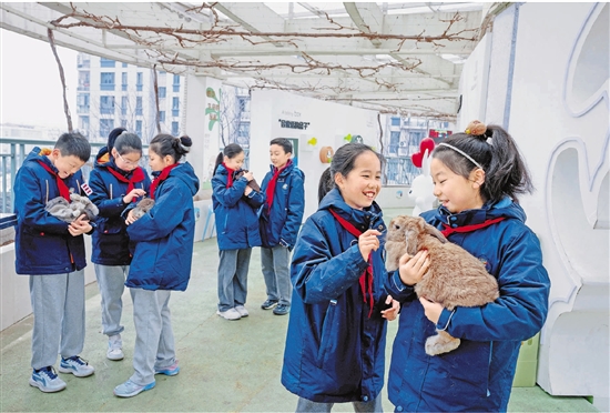 杭州市濮家小学笕新校区的学生们在课间休息时来到兔房喂养兔子。
