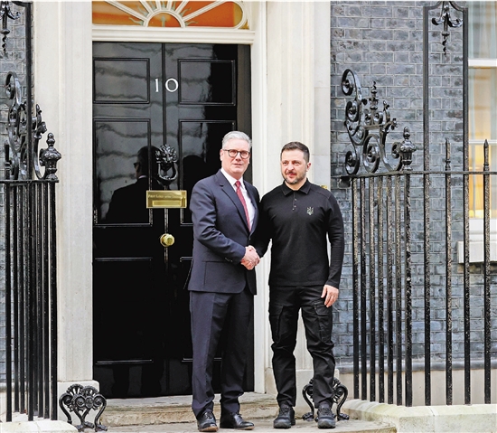 3月1日,在伦敦唐宁街10号首相府前,英国首相斯塔默(左)与乌克兰总统泽连斯基握手。 新华社发