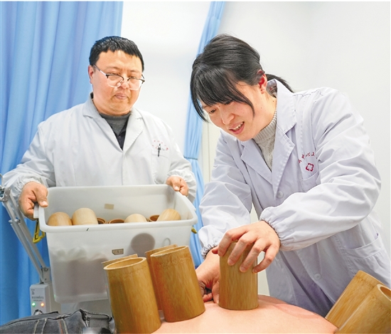 记者(右)在陈小勇的指导下为患者取火罐。 共享联盟·金东 陈怡滢 陈婺 摄