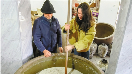 在南村村薛记酒坊,记者徐添城(右)体验酿制黄酒。 本报记者 苗丽娜 摄
