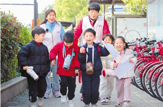 | 最近,杭州九华社区推出“共享奶奶”,帮忙接送双职工家庭的孩子上下学,目前已有五位奶奶参与活动。放学后,“共享奶奶”把小朋友接到社区办公地点,孩子们可以在这里看书画画,等待家长下班后接回家。图为3月17日,两位“共享奶奶”正在接幼儿园大班的小朋友放学。 本报记者 吴新燕 摄 |