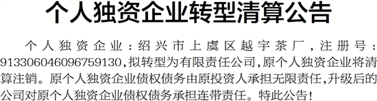 个人独资企业:绍兴市上虞区越宇茶厂,注册号:913306046096759130,拟转型为有限责任公司,原个人独资企业将清算注销。原个人独资企业债权债务由原投资人承担无限责任,升级后的公司对原个人独资企业债权债务承担连带责任。特此公告!