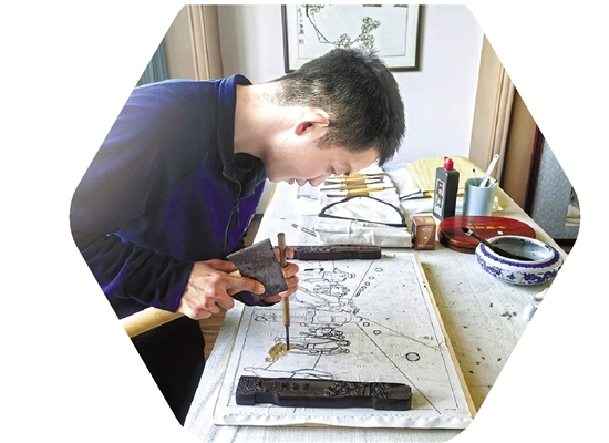 东阳市消防救援大队消防员在雕刻木雕画。 张哲星 摄