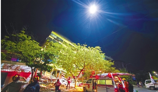 当地时间3月31日晚,中国红十字国际救援队在缅甸曼德勒市使用浙产照明无人机开展人员搜救。 本报记者 陆斯超 通讯员 沈廷冲