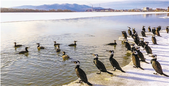 近日,随着气温回升,黑龙江省迎来候鸟迁徙高峰期。图为3月29日,一群鸬鹚聚集在黑龙江省饶河县的乌苏里江畔休息、觅食。