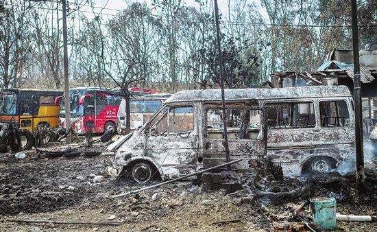 马来西亚雪兰莪州蒲种地区因燃气管道爆炸引发的大火于4月1日下午被扑灭,大火导致112人受伤,事故原因仍待进一步调查。图为在燃气管道爆炸事故中损毁的车辆。 新华社发