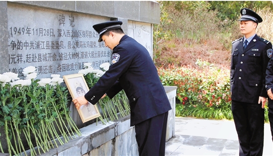 新警将冯福荣烈士复原画像庄重摆放在纪念碑前。 金华公安供图