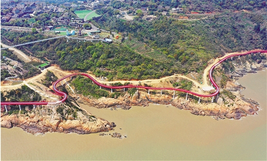 4月6日,在玉环市干江镇沿海绿道建设现场,挖掘机轰鸣,运输车辆来回穿梭,工人在进行工程扫尾及附属道路施工作业。近年来,玉环市以省、市、县三级民生实事项目为载体,促进城乡统筹发展。 拍友 段俊利 摄