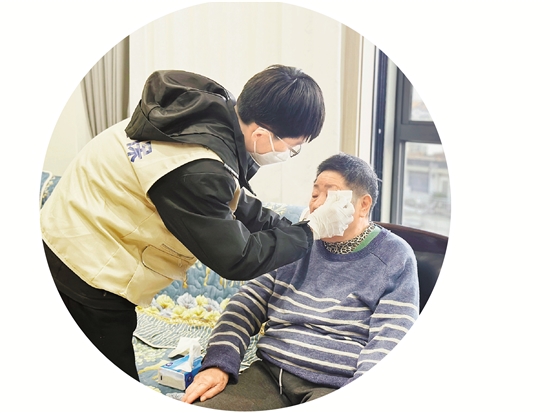 舟山长期护理员钱科瑜为叶婆婆擦脸。 陈卓妤 摄