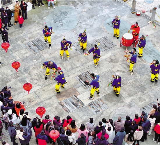 陈文杰融入到村里大奏鼓表演队伍中,为游客展示大奏鼓的魅力。