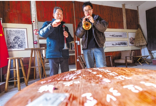 擅长大奏鼓的村民陈冬生(左)在陈和隆旧宅的桌子上写下曲谱,一句一句教陈文杰吹唢呐。