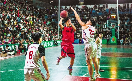 4月13日,大地流彩·2025年全国和美乡村篮球大赛(村BA)启动仪式在贵州省黔东南苗族侗族自治州台江县台盘村举行。图为当日雷山县望丰乡代表队和黎平县尚重镇代表队球员在揭幕战中。 新华社记者 陶亮 摄
