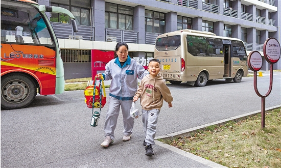 | 每个工作日的早上,温岭市经济开发区的利欧集团员工都会把子女送到企业托管中心,交给专职老师看护。自2016年起,利欧集团为解决员工子女看护难题,成立公益托管中心——“小狮子成长营”,截至目前已累计免费服务超过1200名职工子女。据介绍,利欧集团成立“小狮子成长营”后,员工流失率下降15%,真正实现了“留人更留心”。图为员工将孩子送到托管中心。 本报记者 朱海伟 摄 |