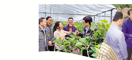 温州市农业技术推广基金会工作人员与郑秋丽(左三)交流桑葚种植技术。