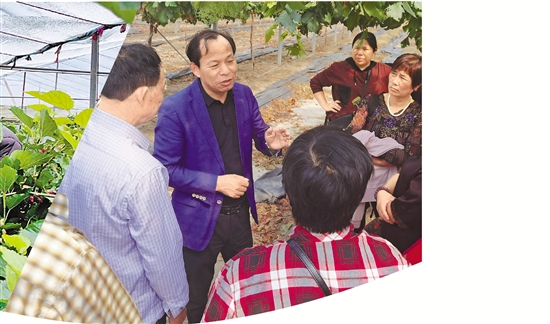 嘉兴市绿江葡萄专业合作社理事长朱屹峰(左二)给农户上技术培训课。