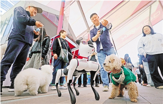 | 4月15日,杭州市“漫绘文明绳、共护邻里情”文明养犬主题宣传活动在西湖区翠苑街道文三数字生活街区0101PARK广场举行。现场开设文明养犬市集,开展养犬政策宣传、提供犬只义诊服务、发出文明养犬倡议,传递文明养犬新风尚。图为文明养犬AI大使“华数机器狗小白”现场与萌宠趣味互动。 本报记者 林云龙 魏志阳 通讯员 周雨佳 摄 |