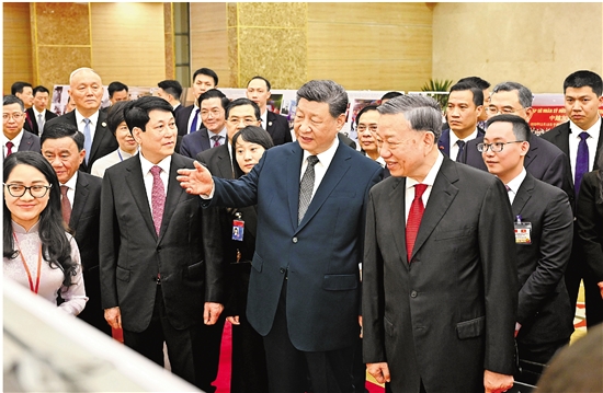 | 4月15日上午,中共中央总书记、国家主席习近平在河内国际会议中心同越共中央总书记苏林、越南国家主席梁强共同会见中越人民大联欢活动代表。这是活动前,习近平在苏林、梁强陪同下,观看中越建交75周年图片展。 新华社记者 殷博古 摄 |