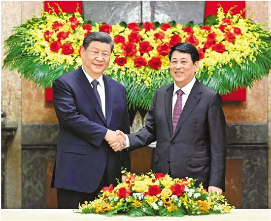4月15日上午,中共中央总书记、国家主席习近平在河内主席府会见越南国家主席梁强。 新华社记者 张领 摄