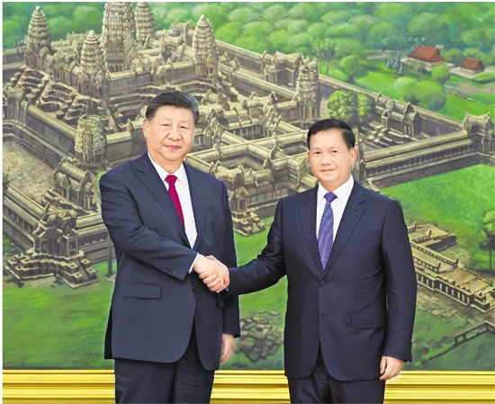 4月17日晚,国家主席习近平同柬埔寨首相洪玛奈在金边和平大厦举行会谈。 新华社记者 刘卫兵 摄
