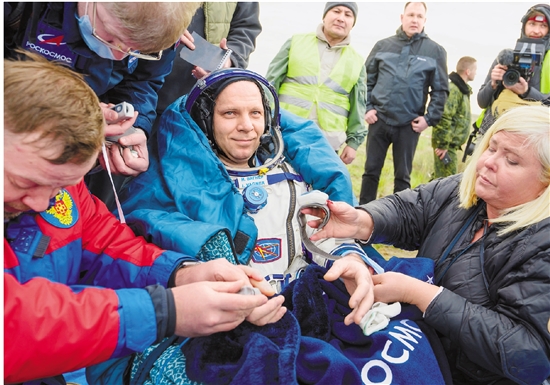 4月20日,在哈萨克斯坦城市热兹卡兹甘附近,俄罗斯宇航员伊万·瓦格纳(中)出舱。 新华社发