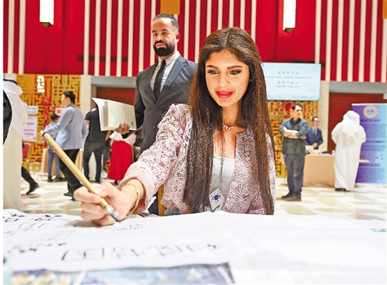 4月20日,参与者在科威特哈瓦利省举行的“国际中文日”暨使馆开放日活动中体验中国书法。 新华社发
