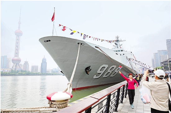 4月22日,市民游客在综合登陆舰沂蒙山舰前拍照留念。