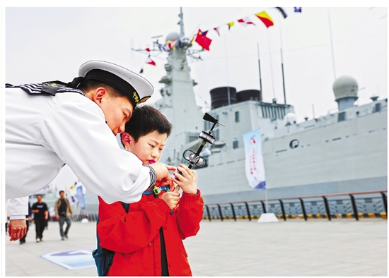 4月22日,一个小朋友在海军战士指导下体验使用三杯风向风速仪。