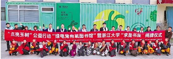 “点亮玉树”公益团队与浙江大学继续教育学院班长会为有氧图书馆揭牌。 姚靖霖 摄