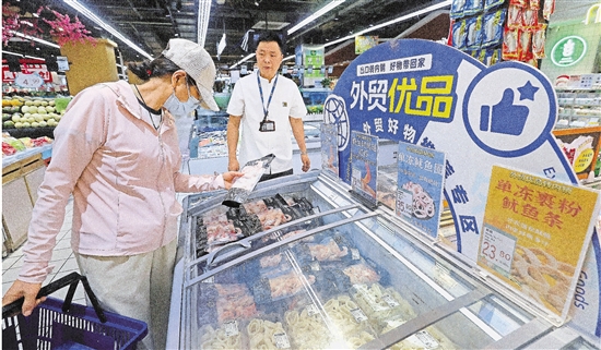 4月23日,杭州联华超市庆春店生鲜区开辟外贸优品专区,销售舟山外贸企业的红虾、鱿鱼圈等,受到不少消费者青睐。目前,杭州多家大型商超、电商平台陆续推出外贸优品拓内销举措,助力外贸企业拓展内销市场。 本报记者 林云龙 摄 |