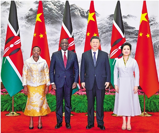 4月24日上午,国家主席习近平在北京人民大会堂同来华进行国事访问的肯尼亚总统鲁托举行会谈。这是习近平和夫人彭丽媛同鲁托和夫人蕾切尔合影。 新华社记者 李学仁 摄