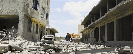 4月27日,在也门萨那,一名男子从美军空袭后的废墟上走过。美国3月15日开始对也门胡塞武装进行大规模空袭,胡塞武装随后对美国航空母舰及其随行舰只发动打击。 新华社发