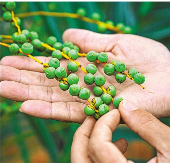在位于海南文昌的中国热科院椰子所椰枣种质资源圃,科研人员查看椰枣幼果生长情况。