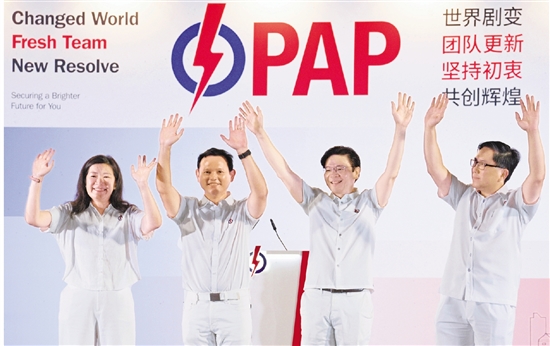 | 5月4日,新加坡现任总理黄循财(右二)在新加坡向人民行动党支持者致谢。新加坡国会选举结果4日凌晨揭晓,执政党人民行动党获得国会97个席位中的87席,赢得国会选举。这次选举是黄循财2024年上任以来,首次领导人民行动党参加国会选举。 新华社发 |