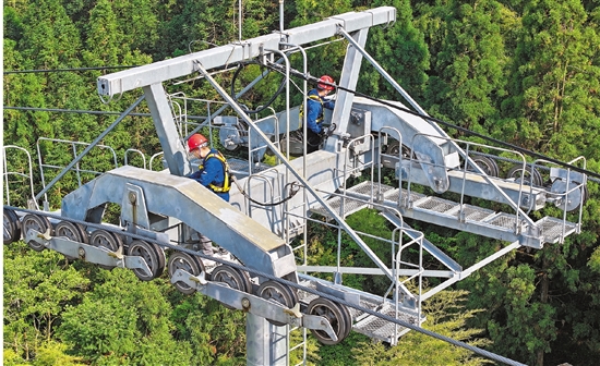 检修人员在检修索道支架。 共享联盟·云和 肖俊康 摄
