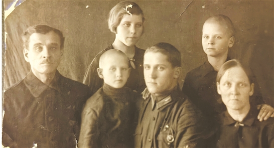 4月30日,在阿列克谢·奥列霍夫家中翻拍的亚历山大·奥列霍夫(前排右二)与家人在一起的老照片。 新华社记者 郑开君 摄