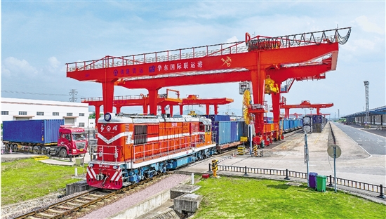 5月7日,在金华市金东区华东国际联运港,一列装载110个标箱日用百货、纺织品类、机械类产品等货物的中欧班列,经海关监管后从铁路金华南站发出,开往俄罗斯、白俄罗斯。“五一”假期,浙江中欧班列合计运送货物近4千标箱,运送商品以太阳能光伏板、汽车零配件、日用百货等浙江本地企业产品为主。 本报记者 金思成 通讯员 时宽兵 陈怡滢 文/摄