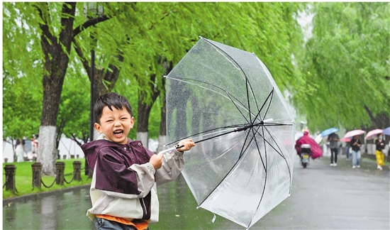 5月8日,西湖边,大风吹歪了孩子的雨伞。 通讯员 里尔 摄